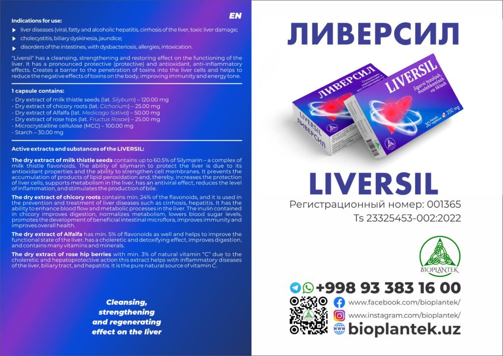 LiversilPencil case – 60 capsules in a blister pack Telegram Whats App Support for liver diseasesLiver diseases (viral, fatty and alcoholic hepatitis, cirrhosis of the liver, toxic liver damage; Treatment of cholecystitis and jaundicecholecystitis, biliary dyskinesia, jaundice; Normalization of intestinal functiondisorders of the intestines, with dysbacteriosis, allergies, intoxication.